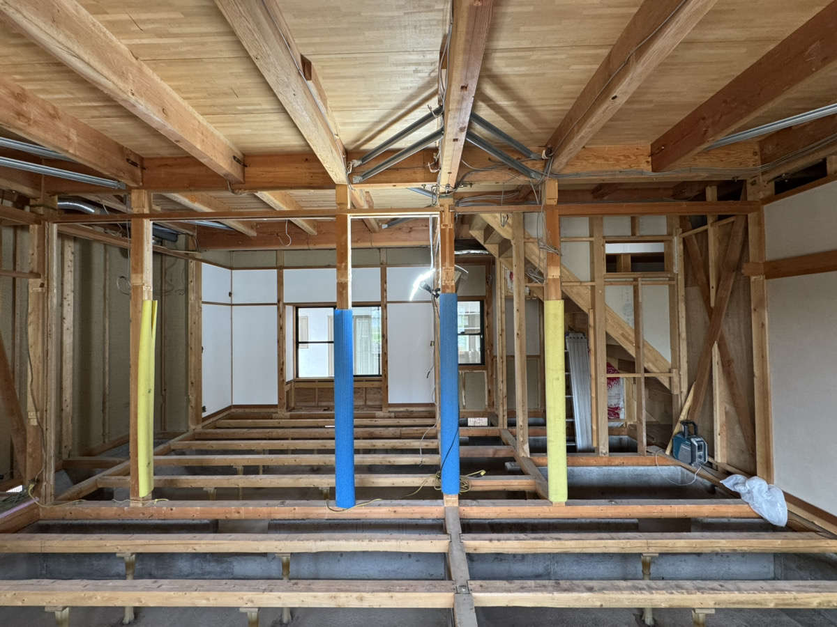 根太床工法で、畳下板と根太を撤去した状態です。