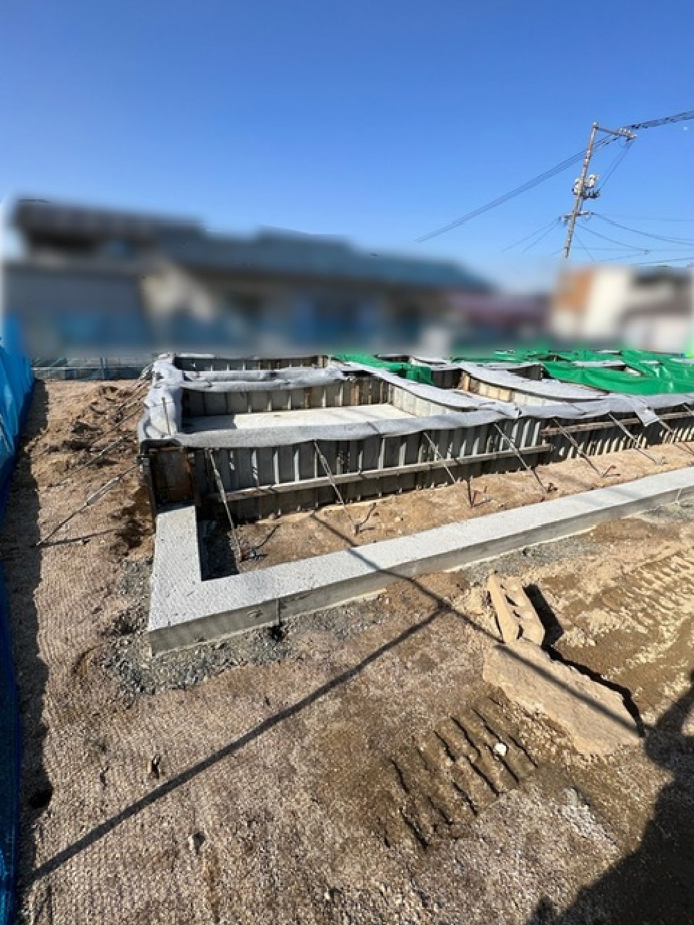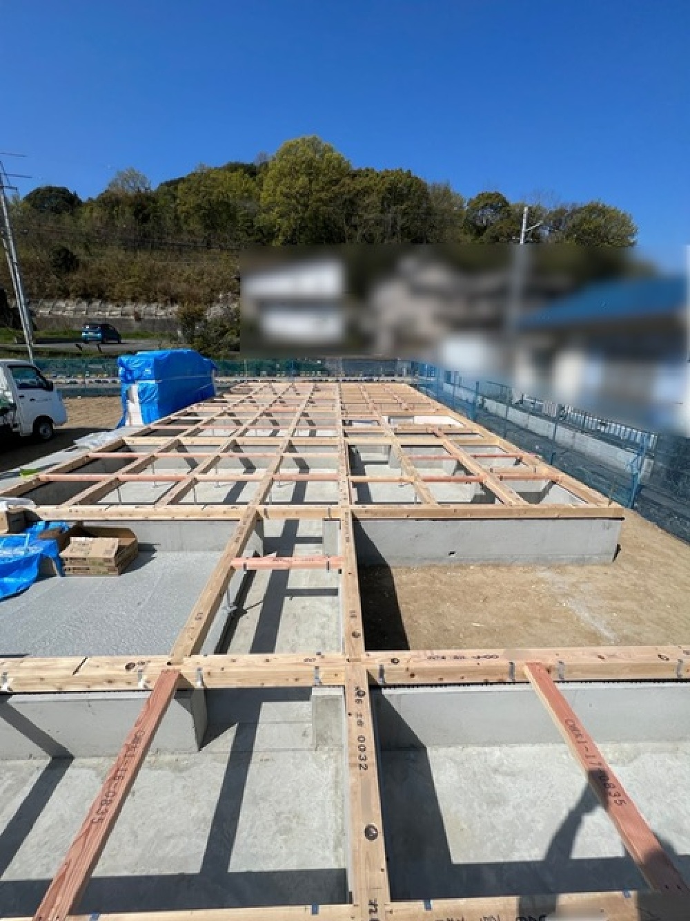 初日に、基礎パッキンを施工、レベル(高さ)確認、土台・大引・根太まで施工します。