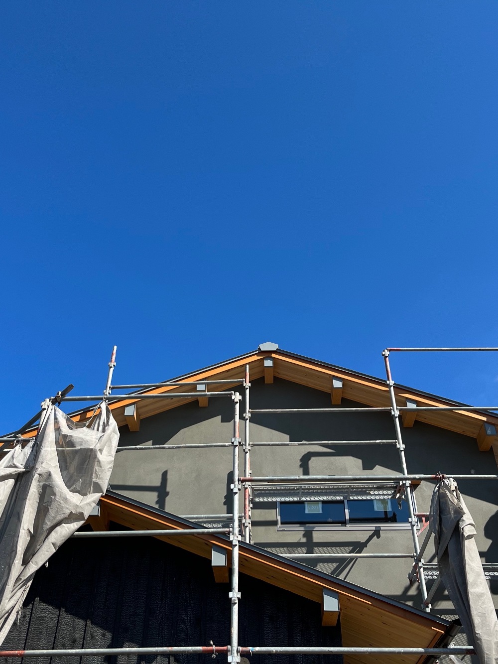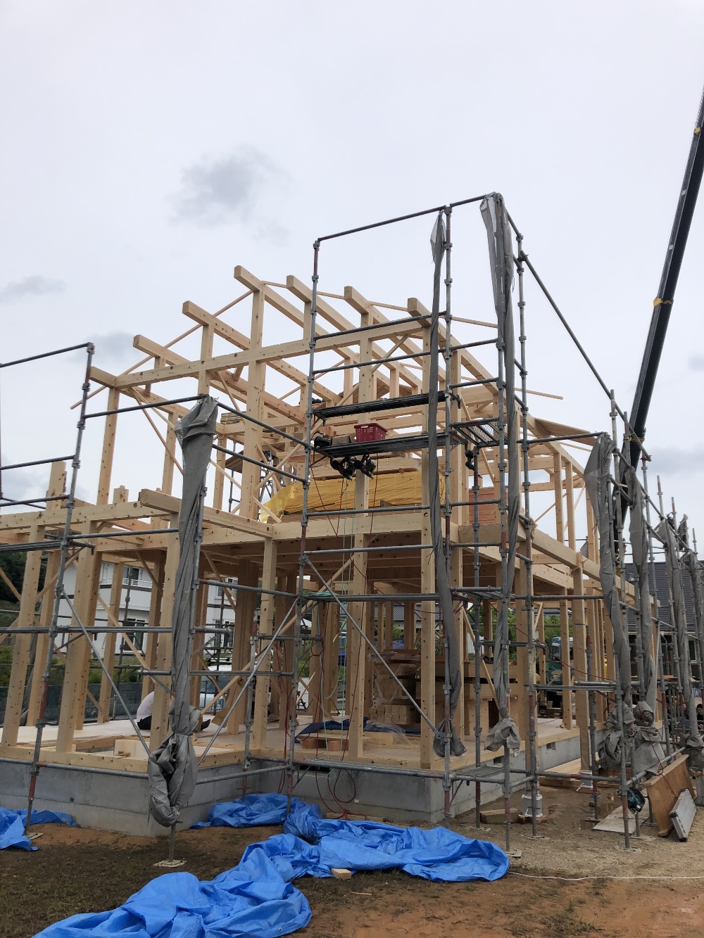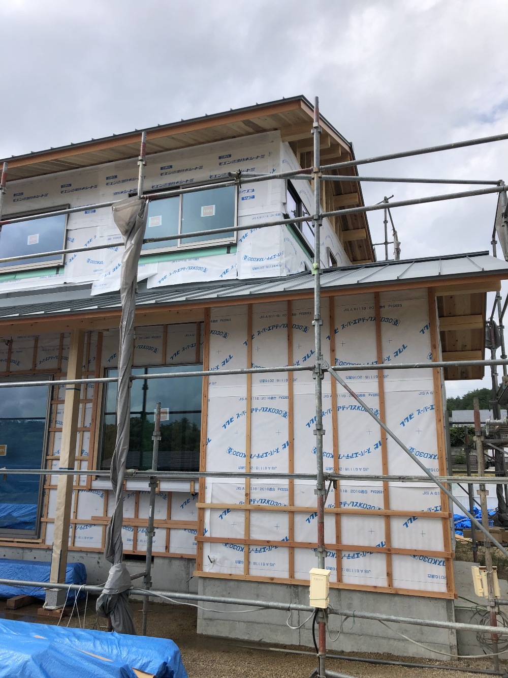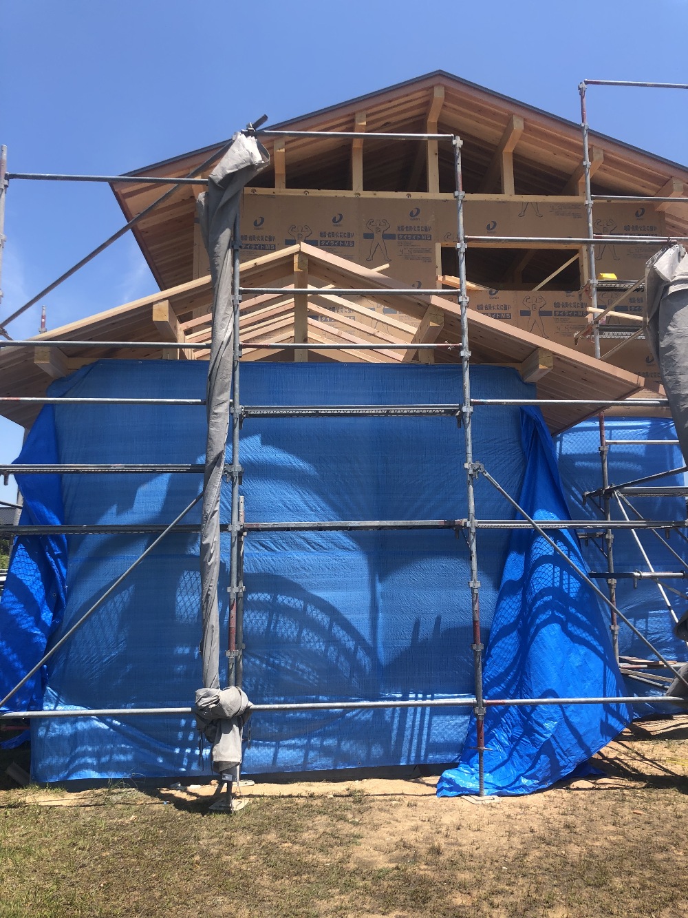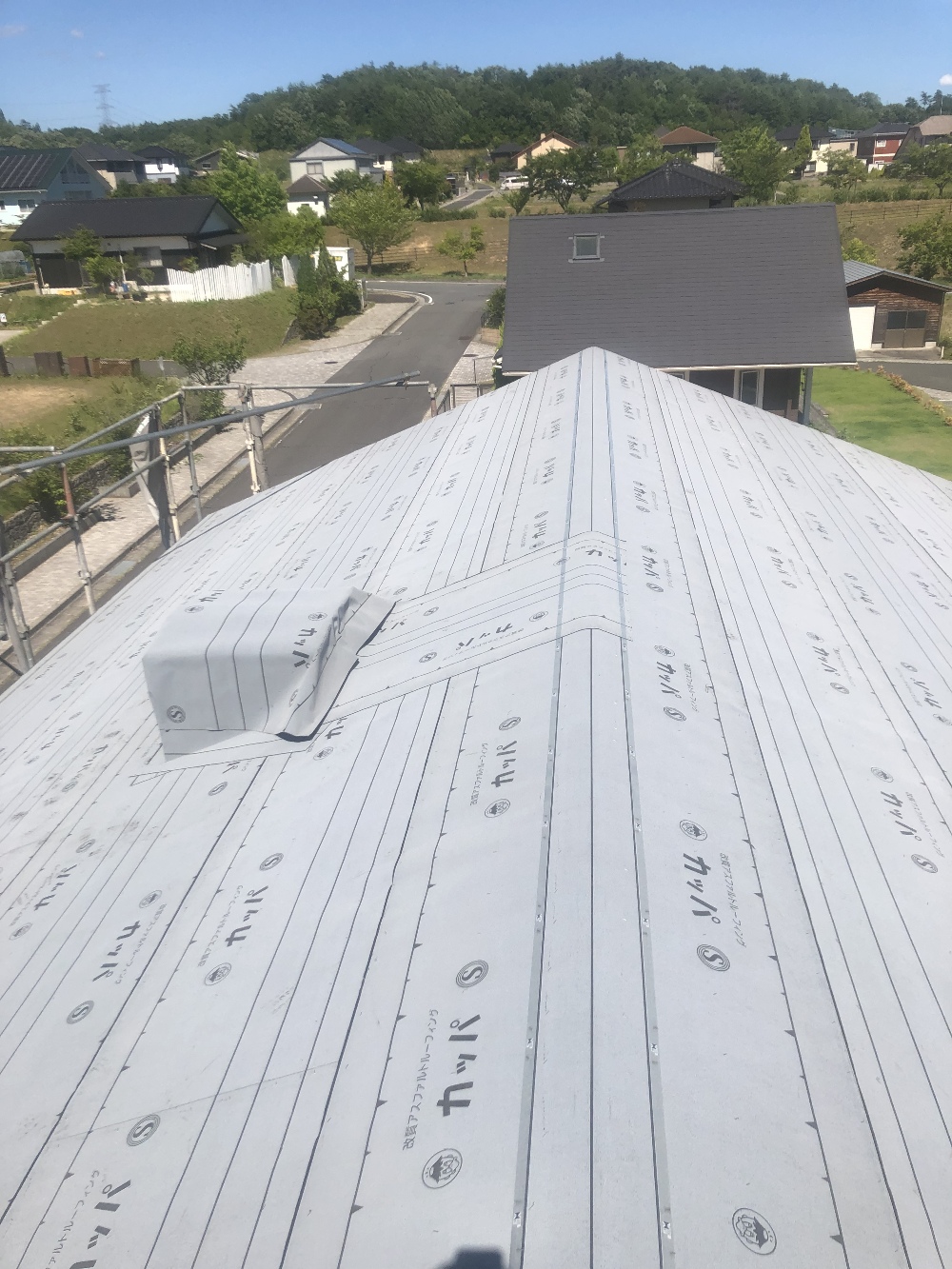 天気にも恵まれ大屋根の施工が終わりました。ルーフィングを貼ったので次はガルバリウム鋼板の板金屋根の施工です。