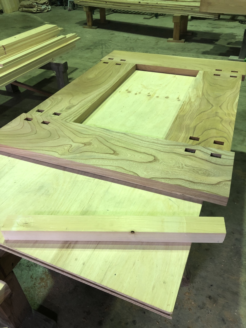 暖炉や囲炉裏使用時の温度上昇でケヤキの乾燥により隙いても直せるようにボルトで締めれるようにしました。