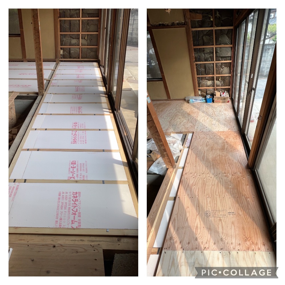 今日は、リビングの床断熱材+合板の施工をします。