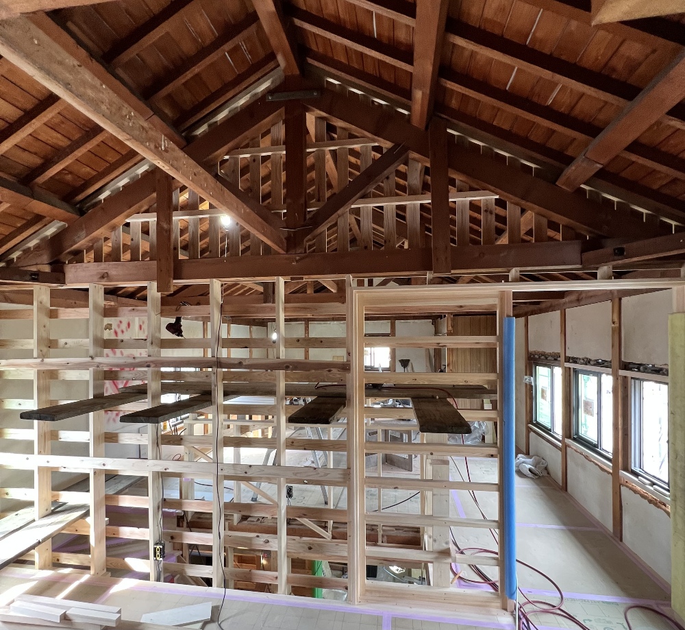 内部に足場を建てて吹抜などの作業をしています。