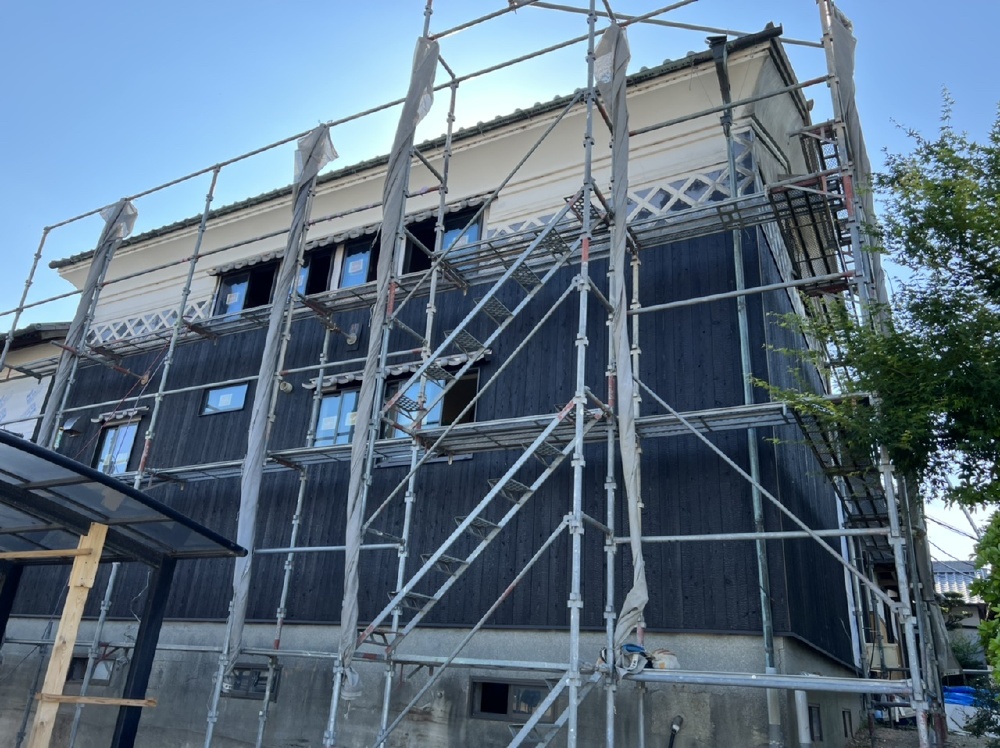 外部、焼板施工中。