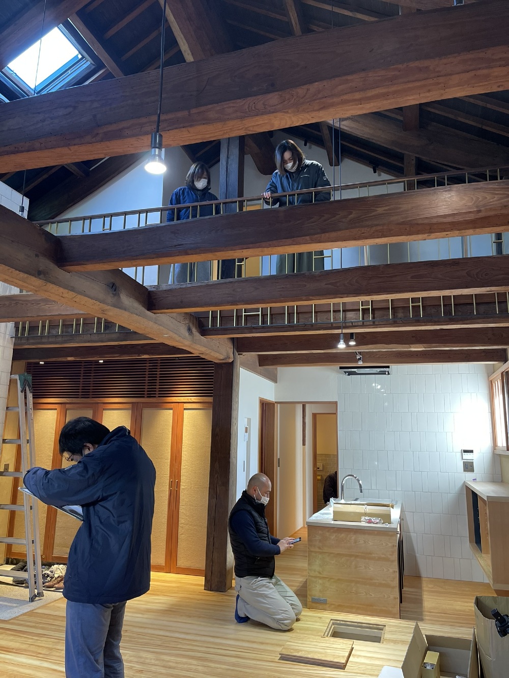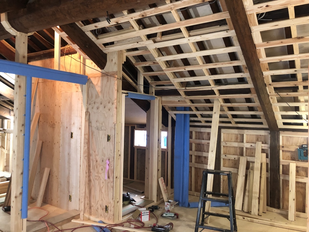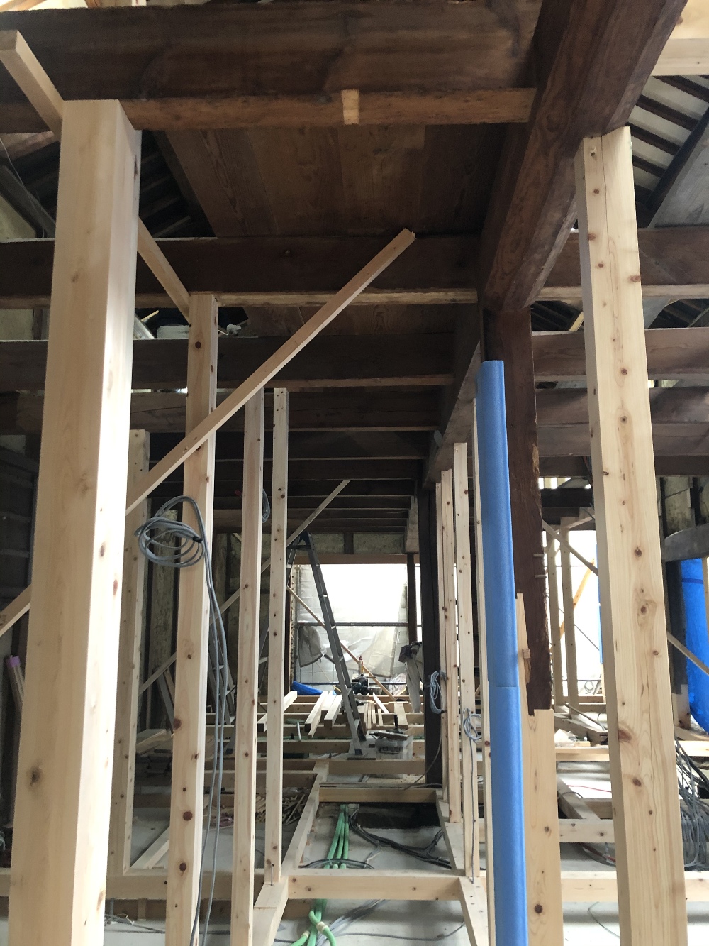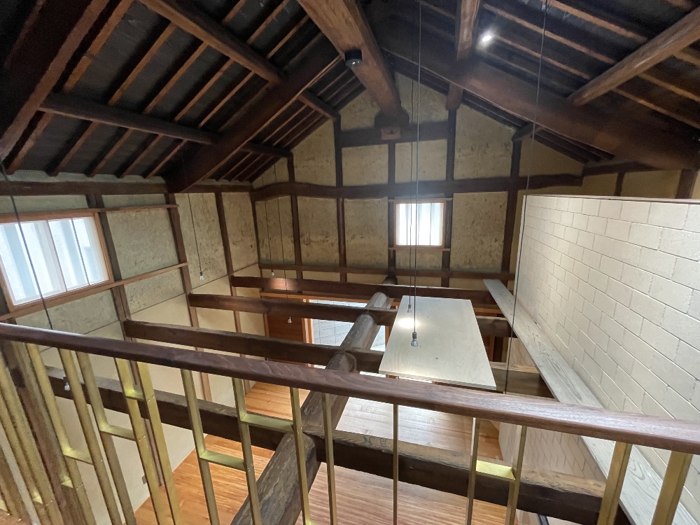 いよいよ、蔵の宿工事も完成が近づいてきました。既存の土壁を活かし吹抜け空間をつくるとこのような雰囲気に仕上がります。