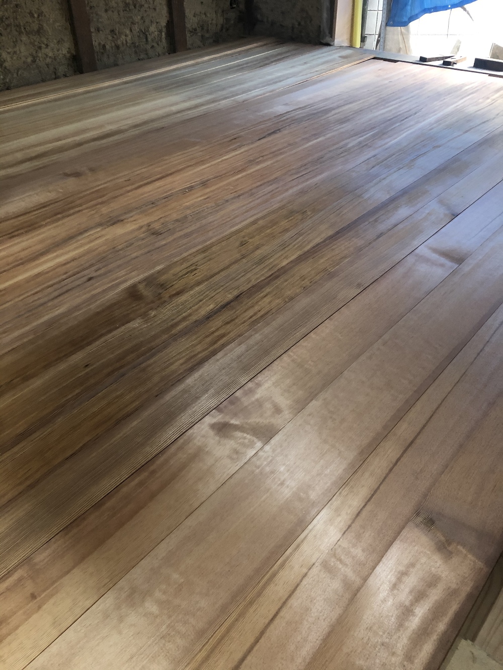 1階のリビング、ベッドルーム、廊下のフローリングは地松の5メートル物を大工に加工してもらいました。貼り方向は違いますけど色合わせ中です。