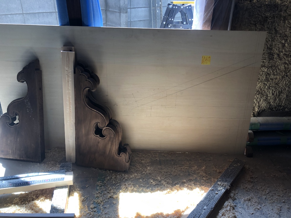 若手の大工さんが原寸図を書いて庇の製作に取り掛かっています。