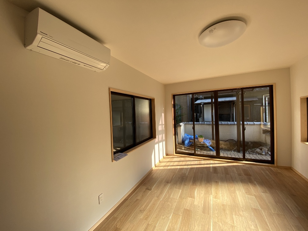 写真では見えにくいですが、ここで見えているフローリングは、エイジング加工が施されているクリのフロアとなります。