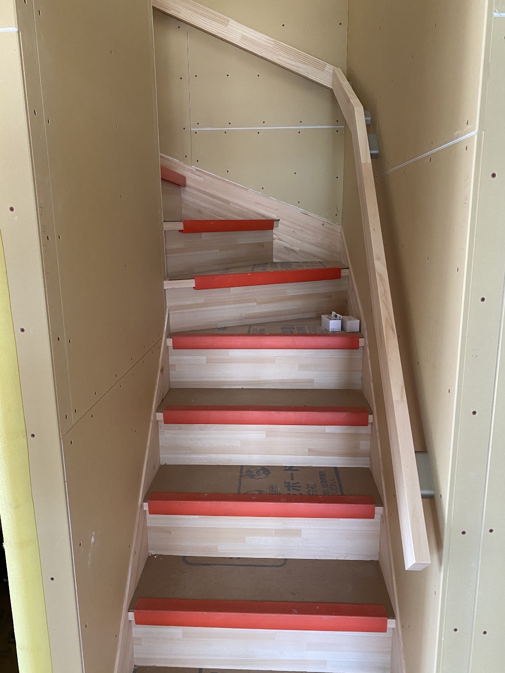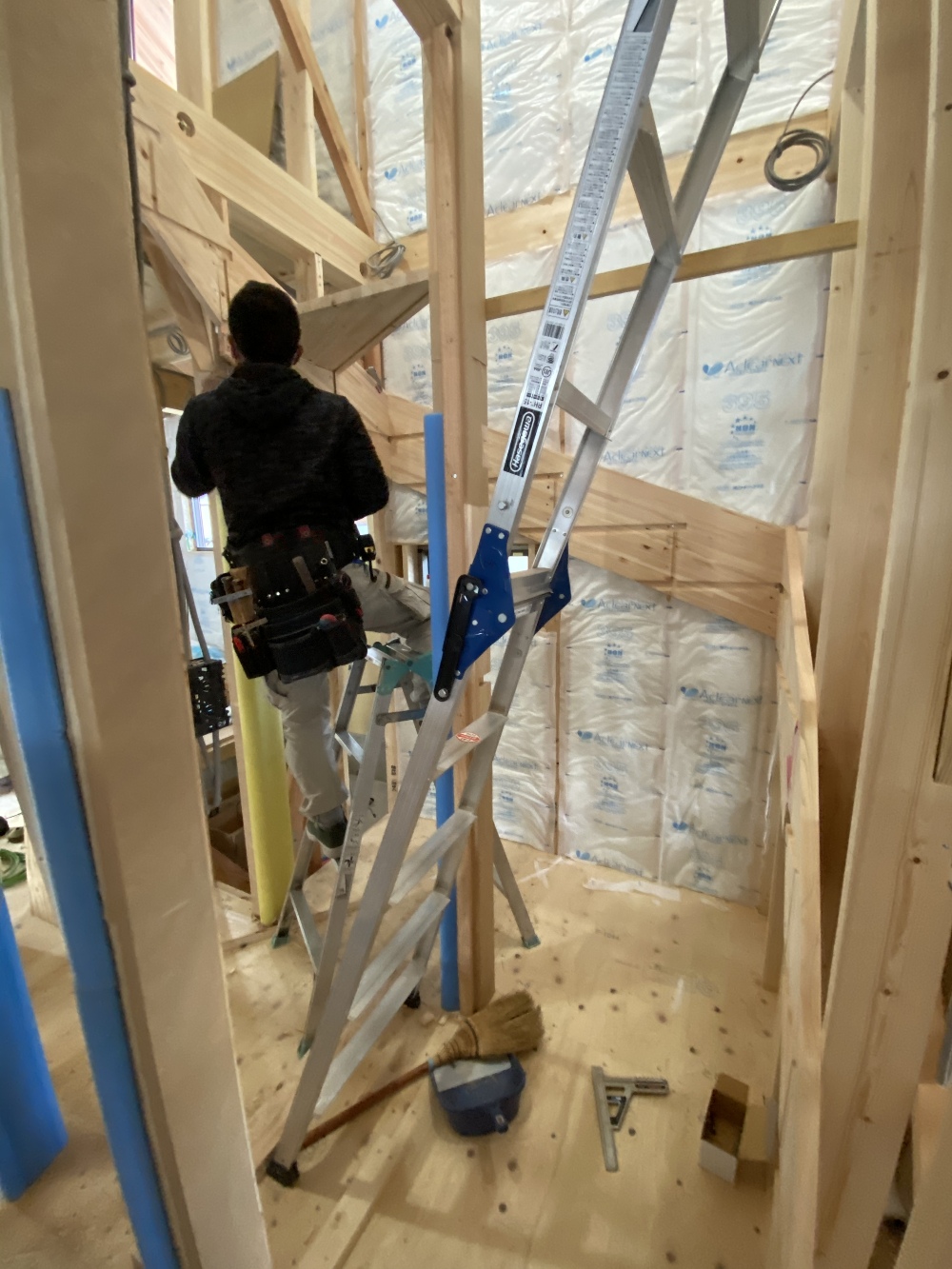 二階フローリングを貼る事を考えて、二階に近い上段から施工してます。