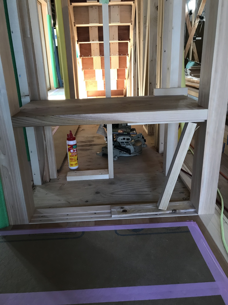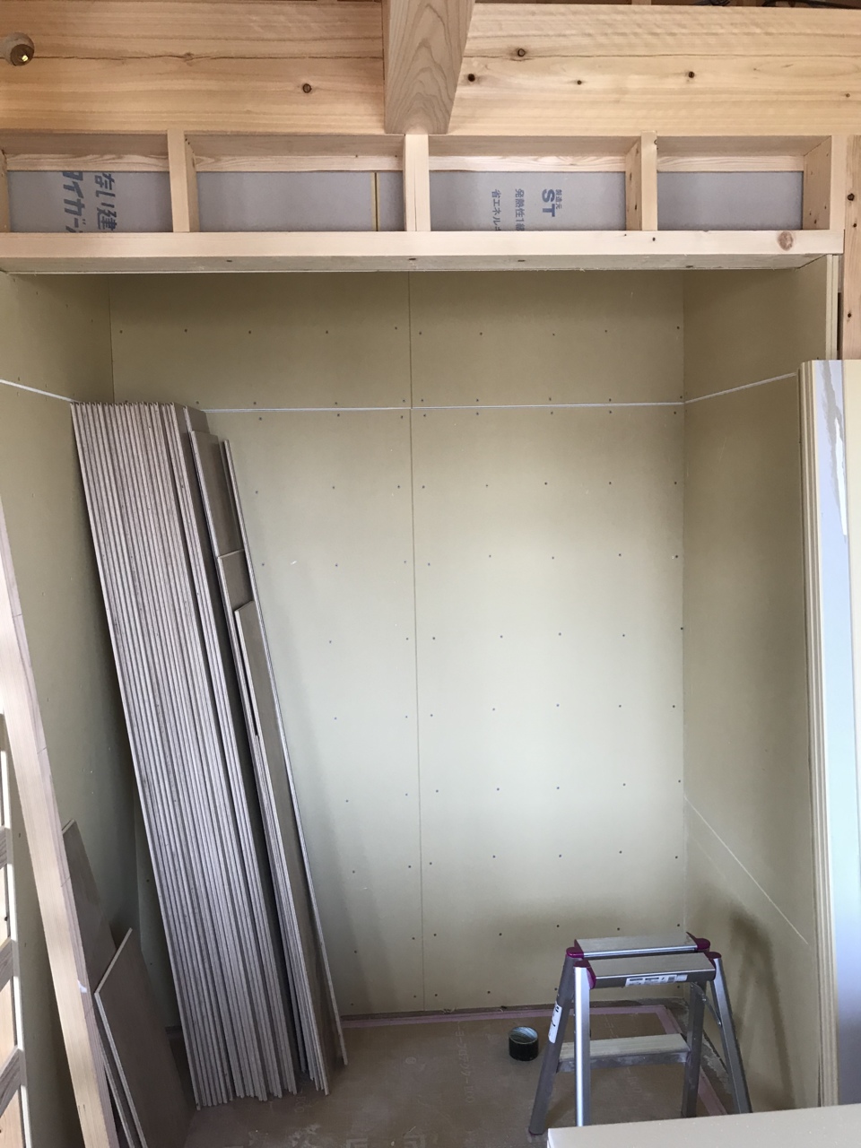 クローゼット枠を施工する前に、ボード張りをしています。