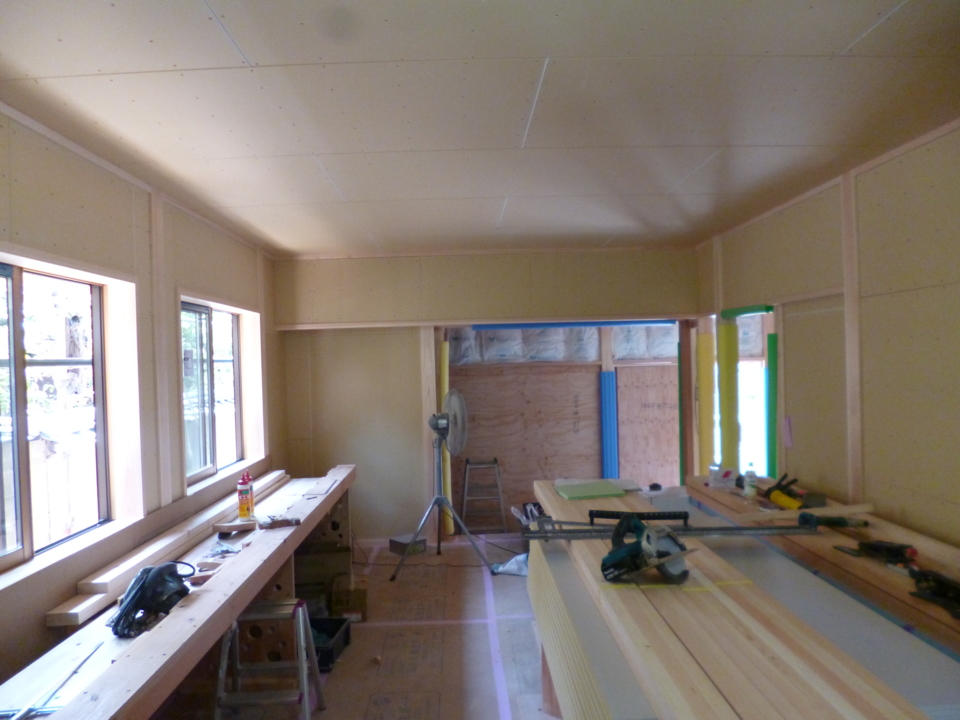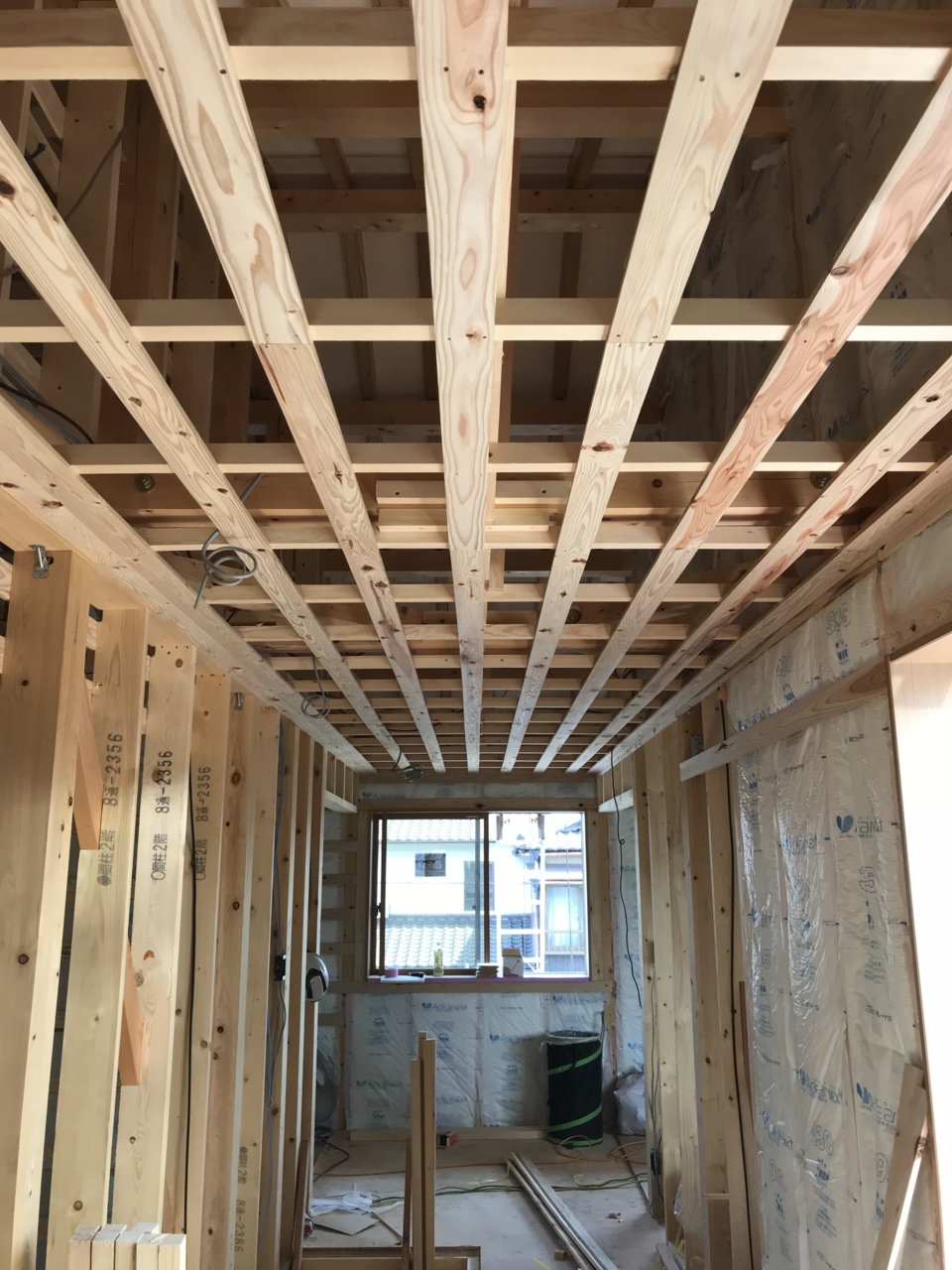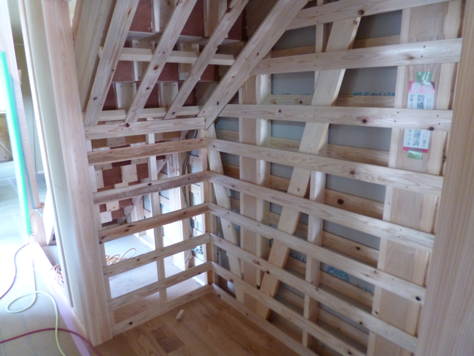 室内壁の下地組みに続いて、天井下地も組みました。