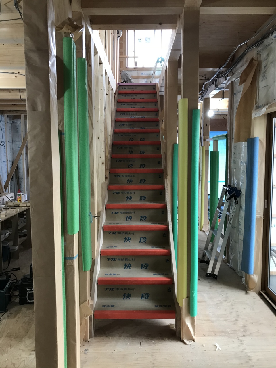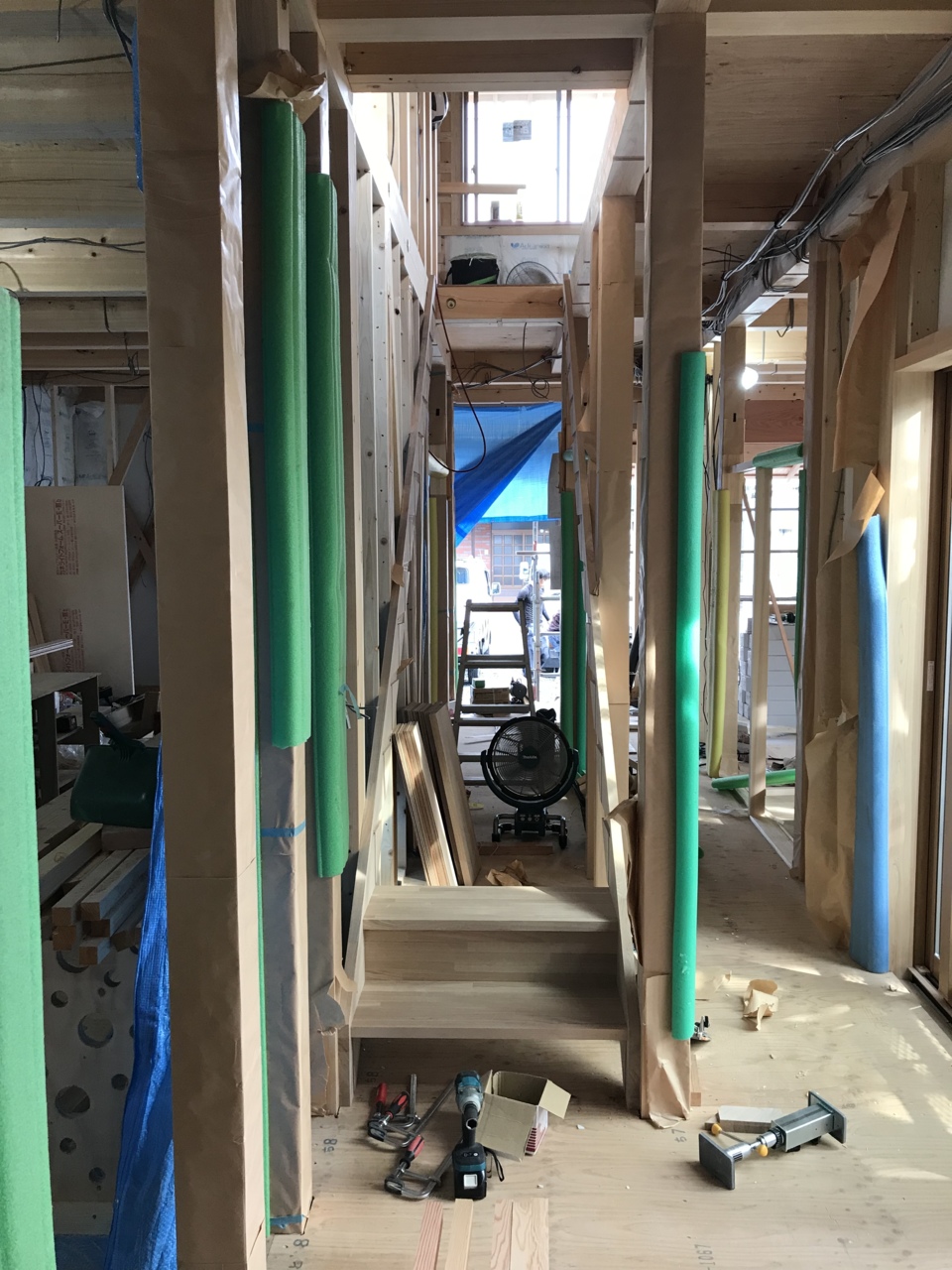 1階も工事が進み、ボードの貼り付けも一部完了しています。