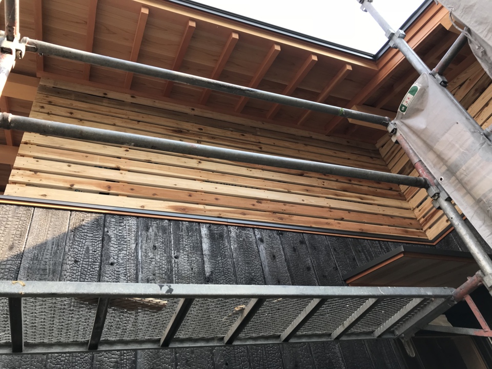 以前ご紹介しました米松の見切りを仕上げの境として、焼板張りの施工をしました。