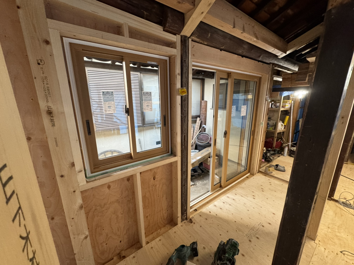 1階のサッシが届きまして、大工さんに取り付けてもらいます。