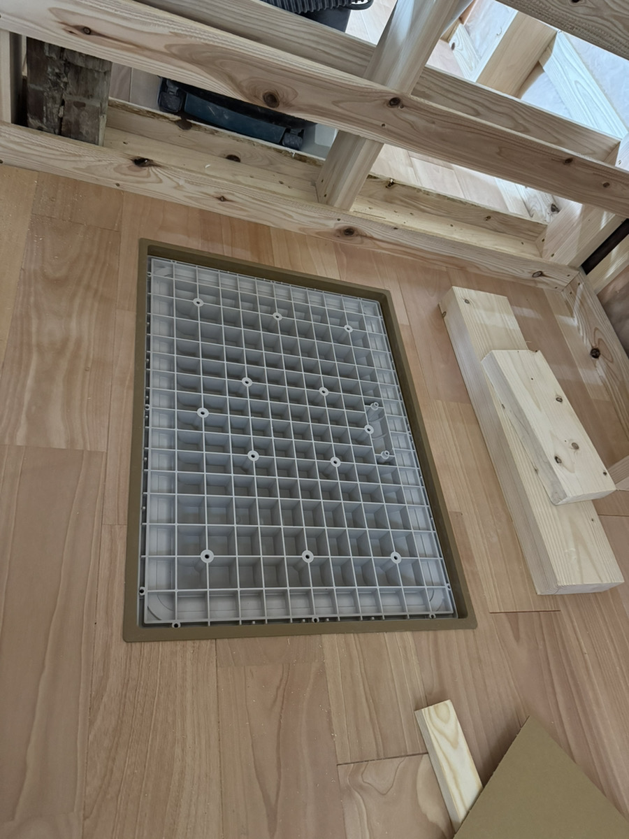 床に穴をあけて床下点検口の施工です。